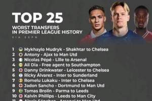 体育资讯4月7日讯 ESPN评选出了英超历史最糟糕的25笔转会,穆德里克加盟切尔西居首,安东尼加盟曼联次之。